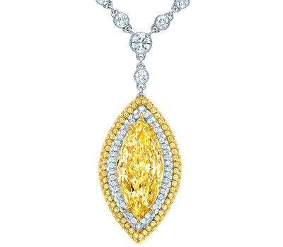 Parmi ses pièces de haute joaillerie que j’ai particulièrement appréciées, il y a ce magnifique pendentif avec un diamant jaune de taille marquise, entouré de petits diamants blancs ronds, eux-mêmes entouré de petits diamants jaunes ronds. La forme en amande du pendentif est sublime et la couleur du jaune tout simplement magnifique.
