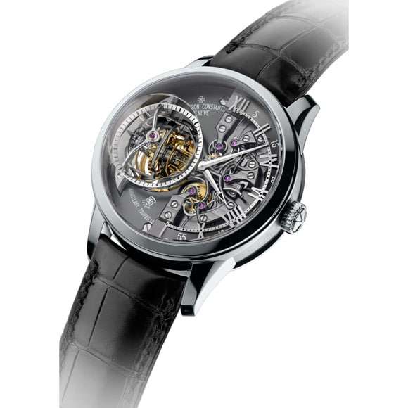 La montre a été conçue par les trois horlogers qui avaient réalisé la Vacheron Constantin 57260 et ses 57 complications. D’ailleurs, ce garde-temps retravaille deux des complications les plus spectaculaires avec le tourbillon armillaire et la double rétrograde.